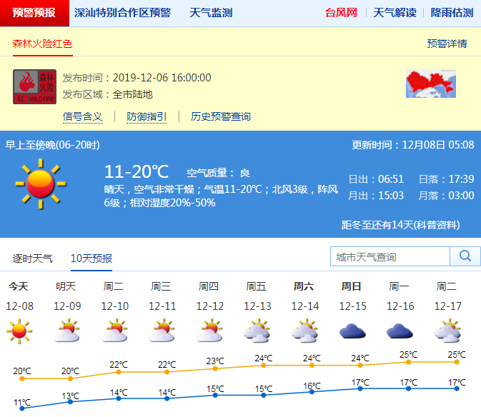 深圳市氣象局預(yù)計8日晴天間多云,空氣非常干燥;氣溫10-20℃;偏北風(fēng)3-4級;相對濕度20%-50%。9-11日晴天間多云,空氣非常干燥,氣溫逐日回升,12-13日多云,晝夜溫差減小。