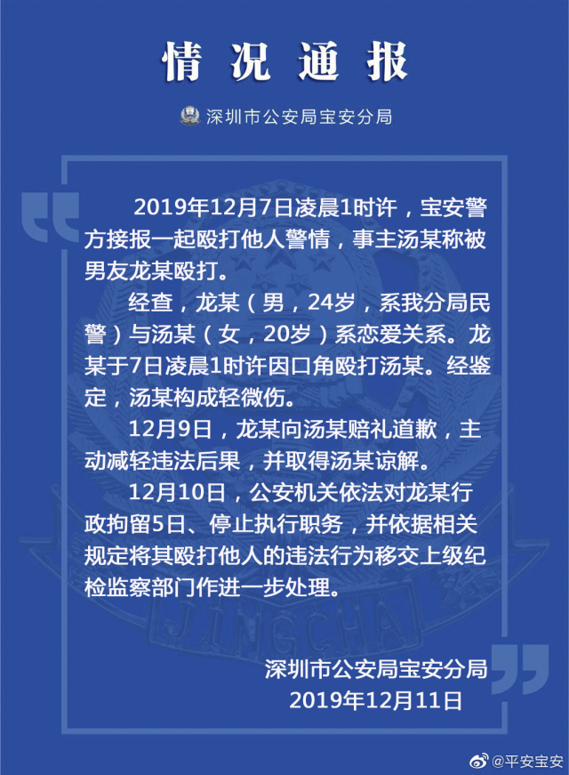 見(jiàn)圳客戶端·深圳新聞網(wǎng)2019年12月12日訊 近日,有媒體報(bào)道了深圳女子被男友從家打到樓道,引發(fā)社會(huì)廣泛關(guān)注。12月11日,深圳市公安局寶安分局發(fā)布通報(bào)稱,家暴施暴男子系寶安分局民警,公安機(jī)關(guān)依法對(duì)其行拘5日,停止執(zhí)行職務(wù)。