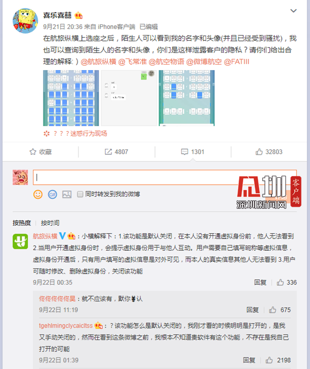微博網(wǎng)友@喜樂喜囍最早爆出航旅縱橫App默認(rèn)開啟陌生人社交功能,圖為頁面截圖。