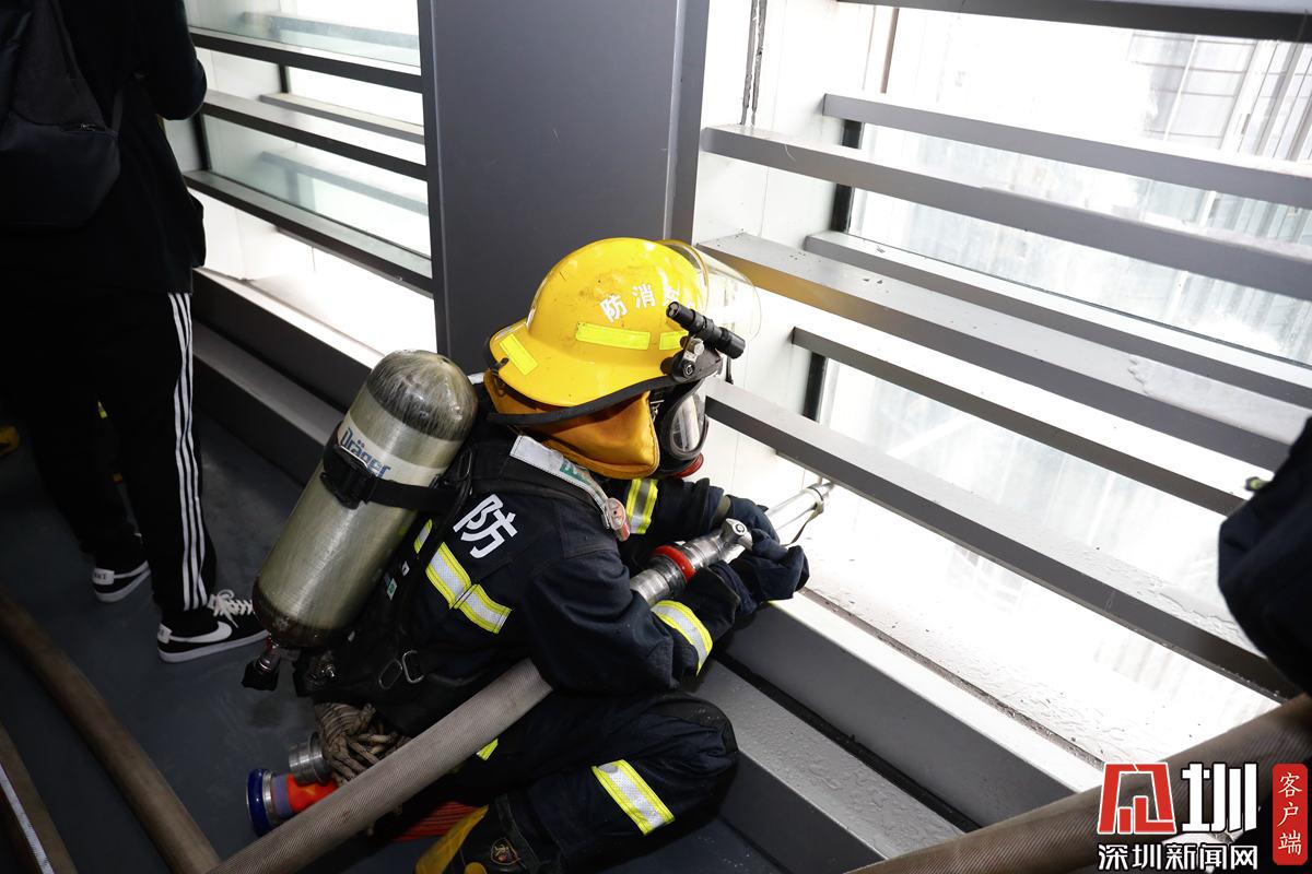 演練開始后,模擬中國華潤大廈24層因電氣線路發(fā)生短路,突發(fā)火災(zāi),火勢迅速蔓延。此時正值上班高峰期,樓內(nèi)有大量辦公人員需要疏散救助,情況十分緊急?!盎馂?zāi)”警報拉響后,大樓內(nèi)部的微型消防站和技術(shù)處置隊進行先期處置。深圳市消防救援支隊同時快速調(diào)派特勤、南山、寶安、福田等大隊48輛消防車、230余名消防員到場處置,并聯(lián)動應(yīng)急管理、交警、醫(yī)療、水務(wù)等部門到場協(xié)同處置。消防救援人員“逆行”深入起火建筑,疏散樓內(nèi)5200余名群眾,同時按照“以固為主,固移結(jié)合”的戰(zhàn)術(shù),利用水槍、水泡、滅火機器人、滅火無人機、舉高消防車、投彈式高層建筑干粉消防車等壓制火勢,最終成功將“大火”撲滅。