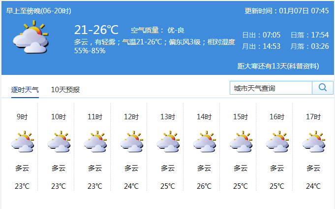 (二)春節(jié)期間(1月24-30日):我市天氣總體平穩(wěn),強冷空氣影響可能性小。氣溫略偏高,平均氣溫19-20 ℃,較近5年平均氣溫(19.1 ℃)略偏高,最低氣溫13-15 ℃,期間可能有2-3天雨霧天氣。