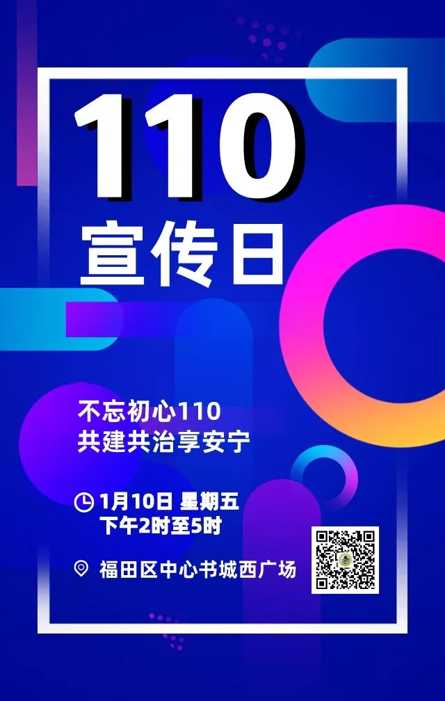 “110宣傳日”來(lái)啦!1月10日下午2時(shí)至5時(shí),福田區(qū)中心書(shū)城西廣場(chǎng)將作為“110宣傳日”主會(huì)場(chǎng),本次活動(dòng)主題是“不忘初心110,共建共治享安寧”。