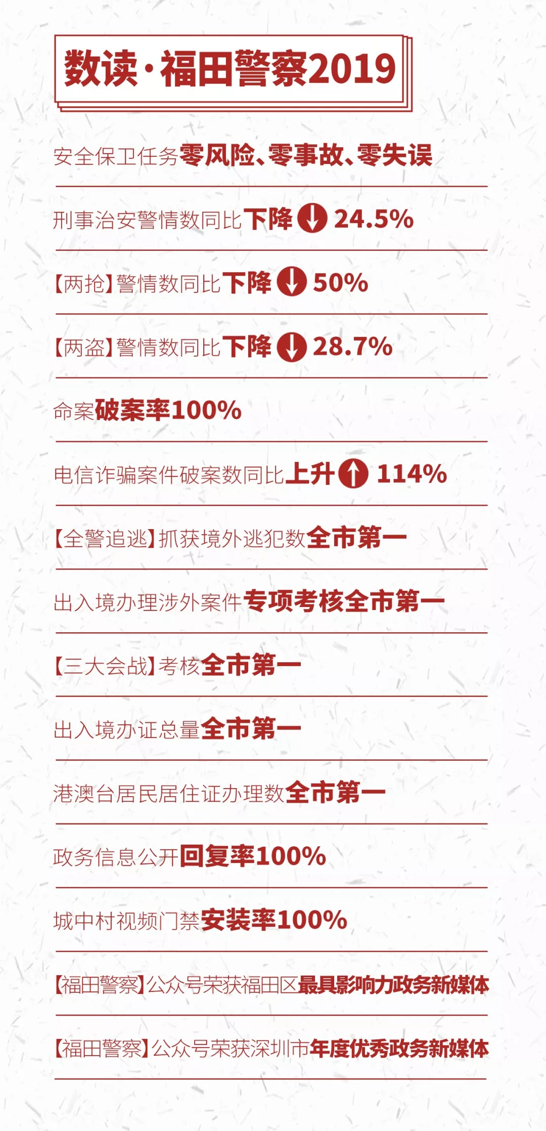 剛剛過去的2019年,是福田公安勇?lián)姑?,砥礪奮進(jìn)的一年,在市局黨委和區(qū)委區(qū)政府的堅(jiān)強(qiáng)領(lǐng)導(dǎo)下,福田公安穩(wěn)中求進(jìn)、攻堅(jiān)克難,穩(wěn)妥應(yīng)對化解系列重大風(fēng)險(xiǎn),有效護(hù)航中心城區(qū)社會(huì)政治穩(wěn)定,打贏新中國成立70周年大慶安保和澳門回歸20周年慶典安保攻堅(jiān)戰(zhàn),各項(xiàng)重大安?;顒?dòng)“零風(fēng)險(xiǎn)、零事故、零失誤”;強(qiáng)力推進(jìn)掃黑除惡、“颶風(fēng)2019”等一系列專項(xiàng)行動(dòng),合成打擊效能突顯;持續(xù)推動(dòng)現(xiàn)代化警務(wù)機(jī)制變革,改革攻堅(jiān)蹄疾步穩(wěn);提升社會(huì)治安基礎(chǔ)治理工作,治安面貌持續(xù)向好;隊(duì)伍建設(shè)舉措剛?cè)嵯酀?jì),錘煉“四個(gè)鐵一般”的過硬警隊(duì)。
