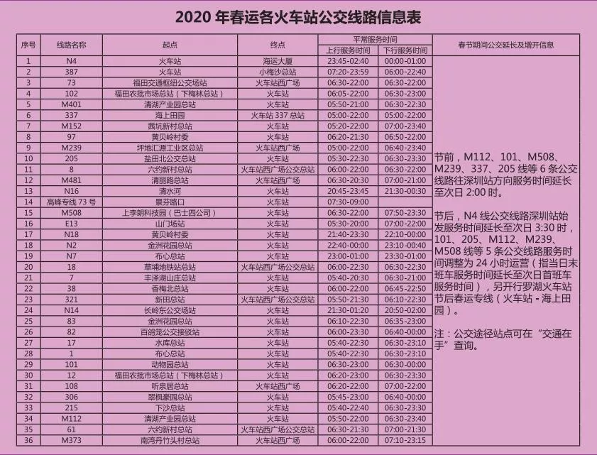 見(jiàn)圳客戶(hù)端·深圳新聞網(wǎng)2020年1月20日訊 又將迎來(lái)離深高峰,為方便大伙趕高鐵火車(chē),深圳的公交地鐵都開(kāi)啟最強(qiáng)加班模式,延長(zhǎng)服務(wù)時(shí)間。很多小伙伴就很關(guān)心,途經(jīng)各大火車(chē)站的公交線有哪些?運(yùn)營(yíng)的時(shí)間是幾點(diǎn)?