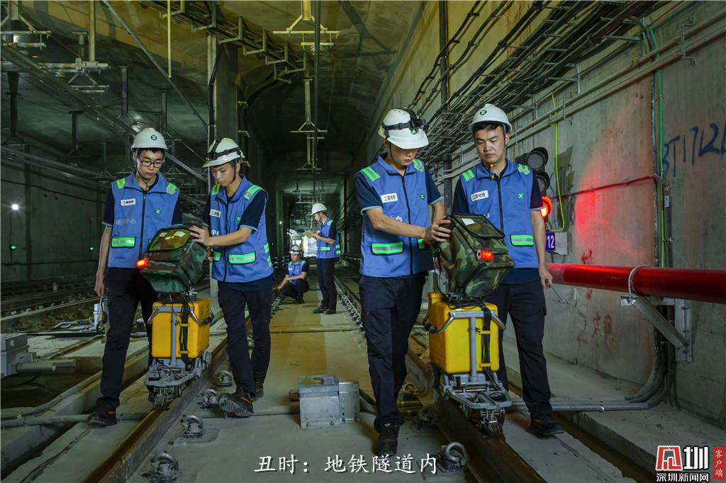 丑時(shí):凌晨2點(diǎn),深圳地鐵維修中心的探傷工正在進(jìn)行軌道探傷作業(yè),確保白天地鐵能正常運(yùn)行。