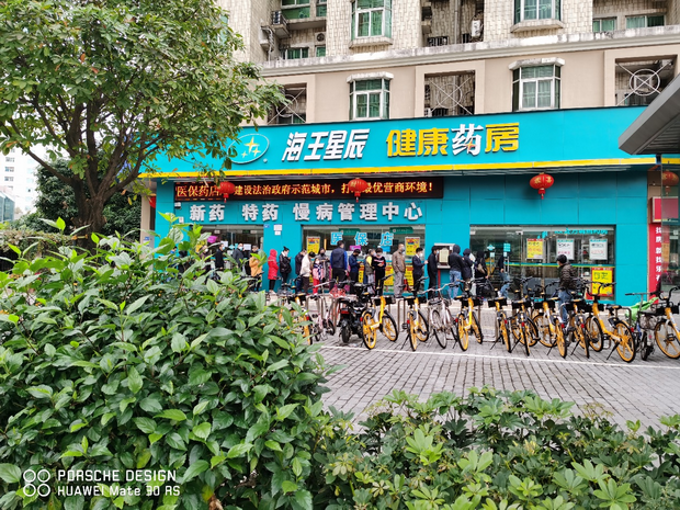 景田海王星辰藥店門口,深圳市民戴口罩排隊購買口罩等防控物品。(蔣溪林 攝)