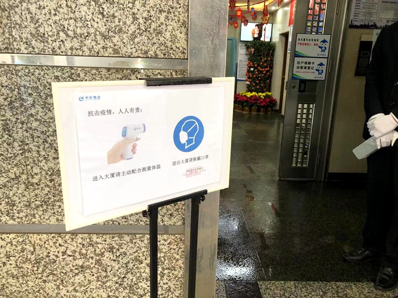 值班保安對每個進入進入小區(qū)的人進行體溫測量和消毒