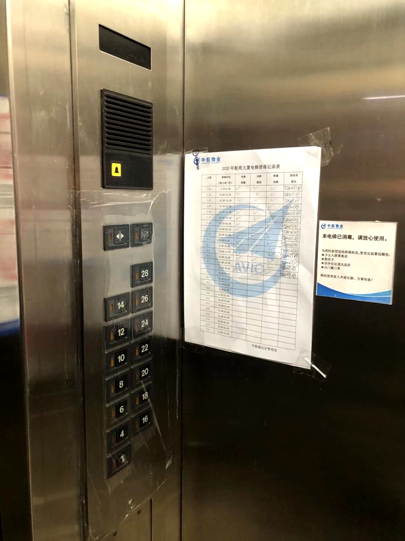 在小區(qū)走廊張貼著多張防疫宣傳海報,大廳的電視上持續(xù)播放防疫工作相關(guān)科普知識。在電梯間記者看到,按鍵都已經(jīng)貼上了一次性塑料膜,旁邊張貼著《2020年航苑大廈電梯消毒記錄表》。