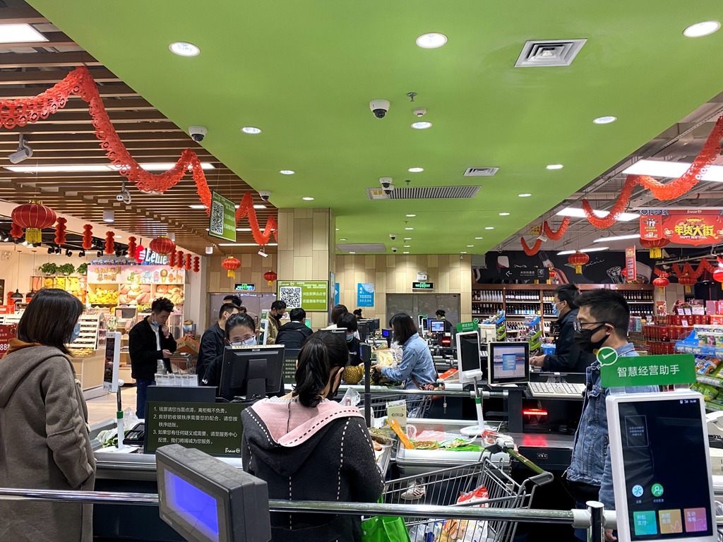 與寂寥的街道相映成趣的是商場(chǎng)內(nèi)排隊(duì)購(gòu)買(mǎi)果蔬的市民