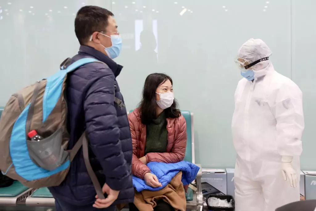 在機(jī)場檢疫站旁,醫(yī)務(wù)人員對旅客進(jìn)行詢問和醫(yī)學(xué)健康篩查。