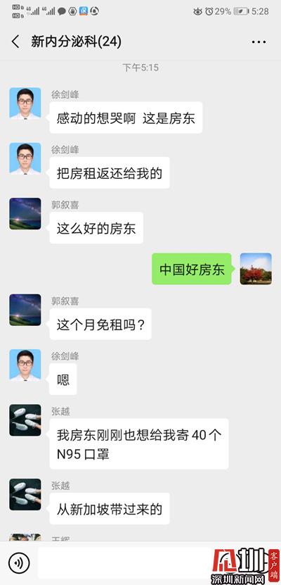 2日上午,寶安中醫(yī)院(集團(tuán))隔離病房工作的徐醫(yī)生,遇到了令他十分感動的事。他通過微信向房東交房租,房東問他是不是在防控前線工作,徐醫(yī)生以為房東怕傳染而嫌棄他,連忙向房東解釋自己做好了防護(hù)消毒,不用擔(dān)心,沒想到房東直接把房租退了回去,表示要支持徐醫(yī)生在前線工作,真是暖心?。?br/>