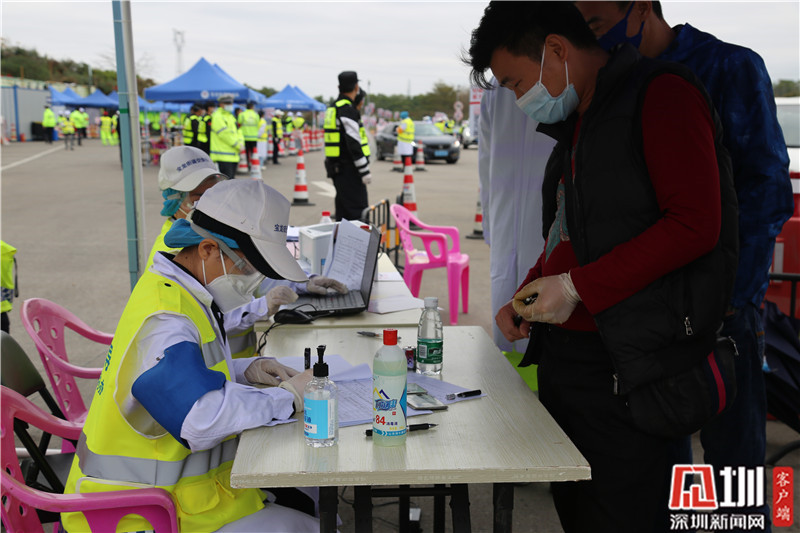 龍崗區(qū)文化館工作人員楊麗(右)負責檢查卡點復檢區(qū)資料錄入工作。