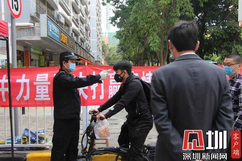 福田梅山苑保安正為一名進(jìn)入小區(qū)的住戶(hù)測(cè)量體溫。