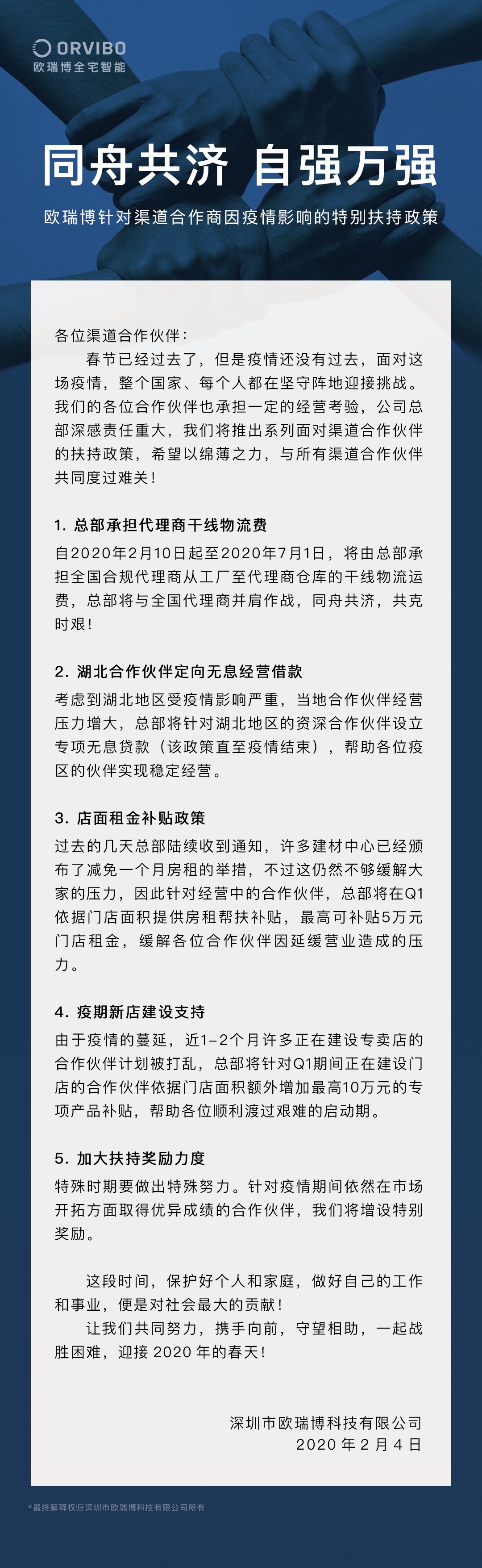 深企歐瑞博發(fā)布多項(xiàng)扶助政策 幫助合作商共渡疫情難關(guān)