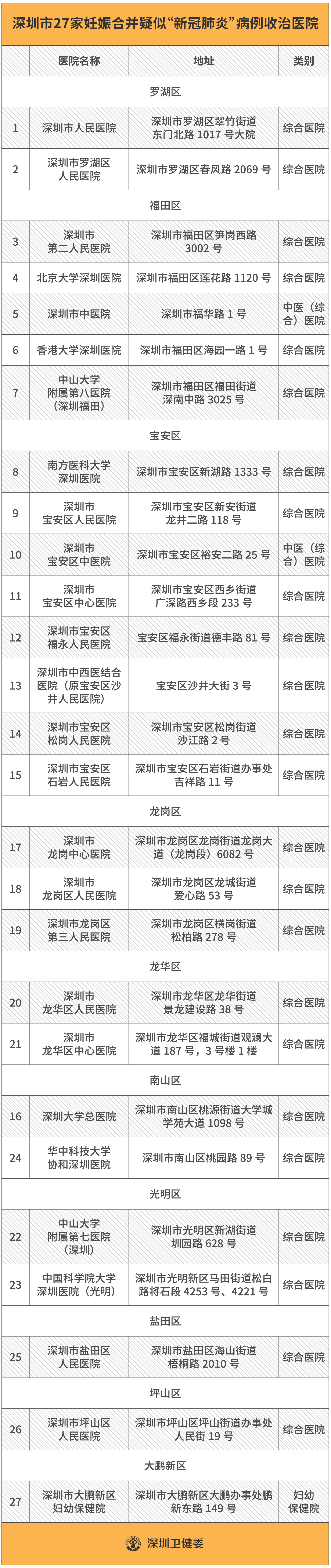 據(jù)悉,深圳共有27家妊娠合并新型冠狀病毒感染感染疑似病例市、區(qū)級(jí)收治醫(yī)院,其中,市級(jí)醫(yī)院8家,區(qū)級(jí)醫(yī)院19家,覆蓋深圳10個(gè)區(qū)(新區(qū))。