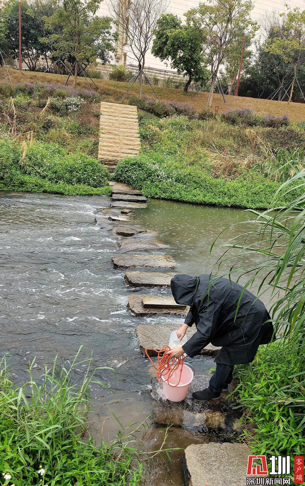 雨天,市環(huán)境監(jiān)測中心站的監(jiān)測人員在南山區(qū)大沙河取樣,進(jìn)行水質(zhì)監(jiān)測。