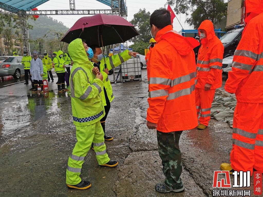 龍崗布吉街道一線工作者在路面筑沙袋墻,將雨水?dāng)r截。