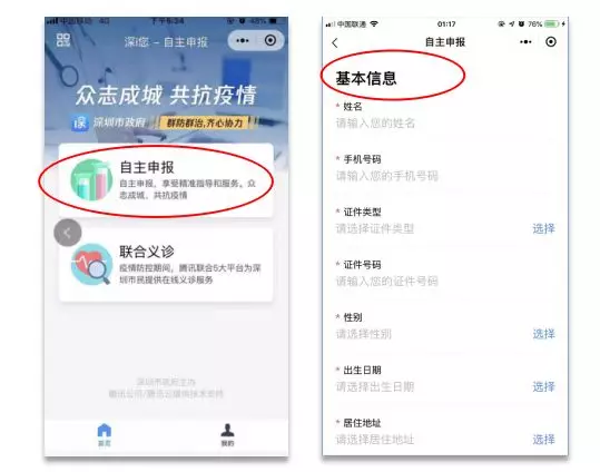 第一步:通過微信搜索“深i您-自主申報”小程序、i深圳公眾號-抗擊疫情-深i您自主申報、“i深圳”APP疫情防控服務(wù)專區(qū)入口等多途徑進(jìn)入自主申報平臺,請根據(jù)實(shí)際情況填寫基本信息、人員類型、是否居家隔離、居住屬性、是否有如下癥狀、其他等信息,其中帶*號和有必選字樣的為必填項(xiàng),請按照平臺提示填寫。