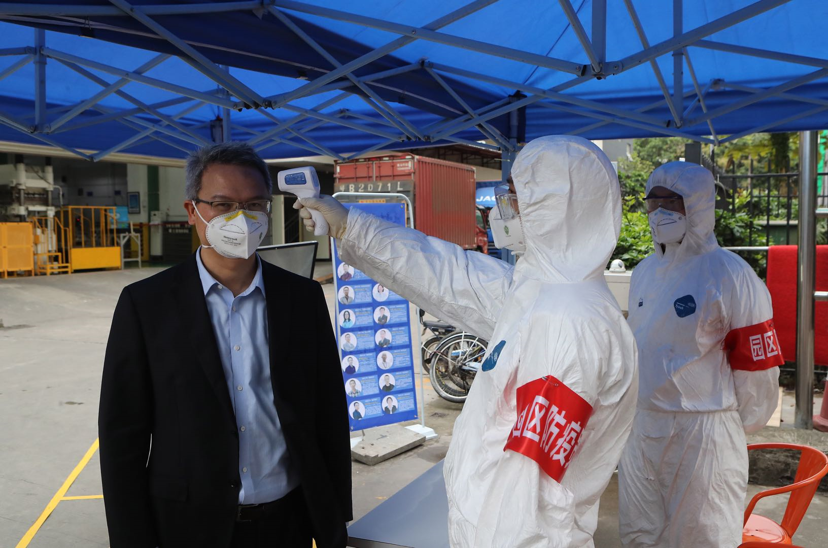 記者驅(qū)車來到該公司園區(qū)門口時(shí),就可以見到工作人員正在對(duì)進(jìn)入園區(qū)的車輛進(jìn)行消殺,在門口,還有多個(gè)海報(bào)上寫著進(jìn)入園區(qū)后的一些注意事項(xiàng),例如在公司就餐的注意事項(xiàng)、自覺接受體溫測量和注意佩戴口罩等。