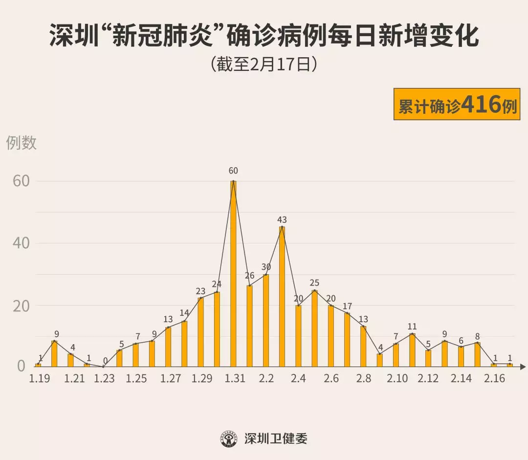 截至2月17日24時,深圳累計(jì)報告“新冠肺炎”確診病例416例。2月17日當(dāng)天全市新增確診病例1例(個案詳情今晚公布)。
