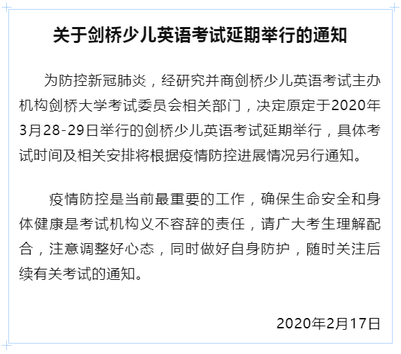 為貫徹落實(shí)國(guó)家和我省對(duì)新型冠狀病毒感染的肺炎疫情防控有關(guān)工作的部署和要求,切實(shí)保障廣大考生和考試工作人員生命安全和身體健康,經(jīng)研究決定,推遲原定于3月7-8日舉行的普通高考英語(yǔ)聽說考試和本科插班生考試(含三二分段專升本轉(zhuǎn)段考試)。具體時(shí)間安排視疫情控制情況另行通知。