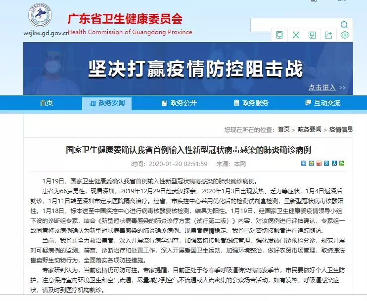 1月19日,國家衛(wèi)生健康委確認廣東省首例輸入性新型冠狀病毒感染的肺炎確診病例。