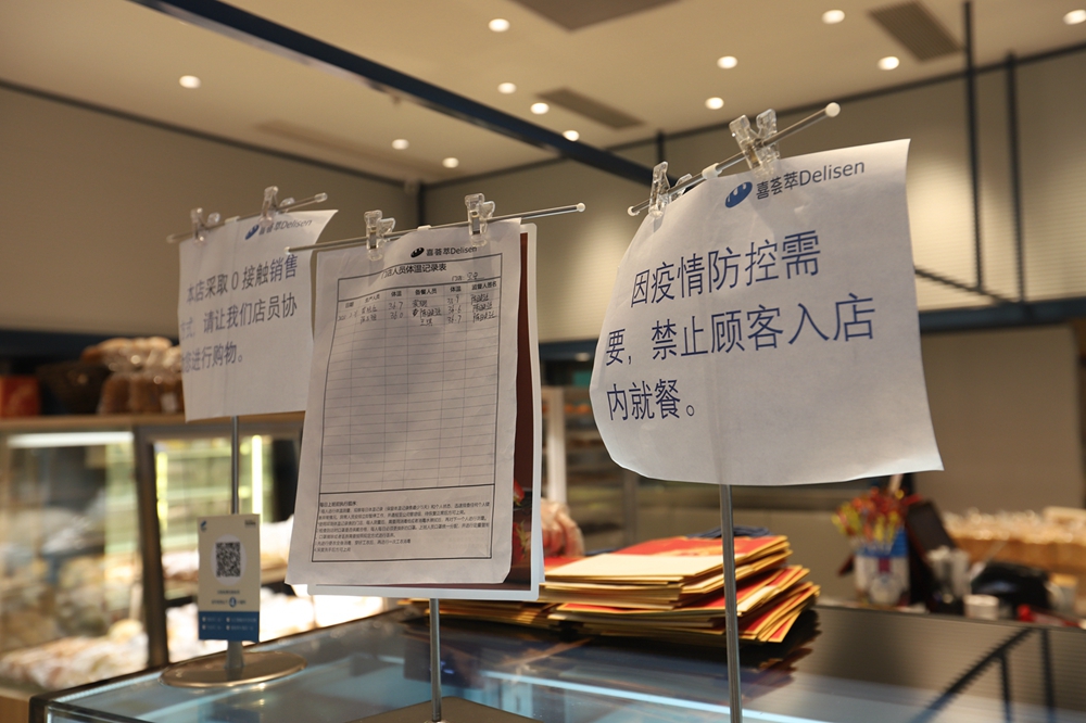 負(fù)二樓的喜薈萃是一家剛開(kāi)業(yè)沒(méi)多久的面包店,記者看到里面燈光明亮、各式面包充盈貨賀,進(jìn)店的通道已全部攔堵,并設(shè)置了取餐及消毒區(qū)。一名市民正在選購(gòu)面包,他站在店外選好款式后,店員將面包打包好并放在取餐處,市民掃碼付款后就可以帶走了。這就是商場(chǎng)內(nèi)實(shí)行的“零接觸”購(gòu)物。