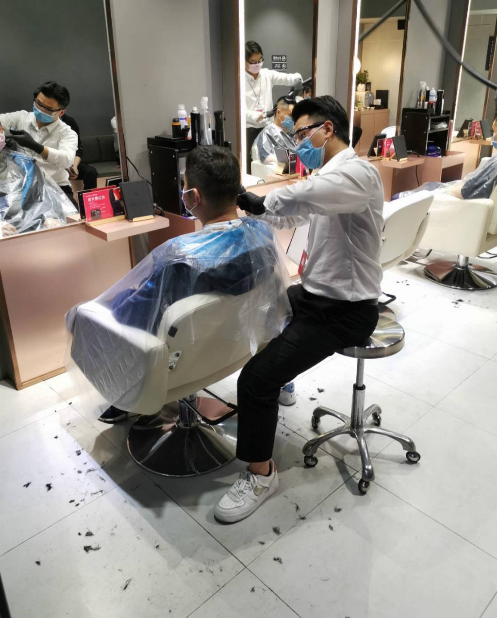 ▲理發(fā)師"準(zhǔn)備齊全",顧客佩戴一次性圍布接受服務(wù)。