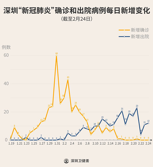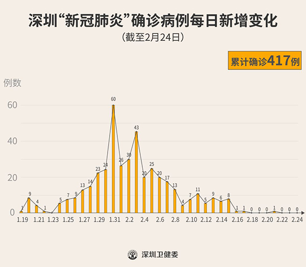 截至2月24日24時,深圳累計(jì)報(bào)告“新冠肺炎”確診病例417例。2月24日當(dāng)天全市無新增確診病例。