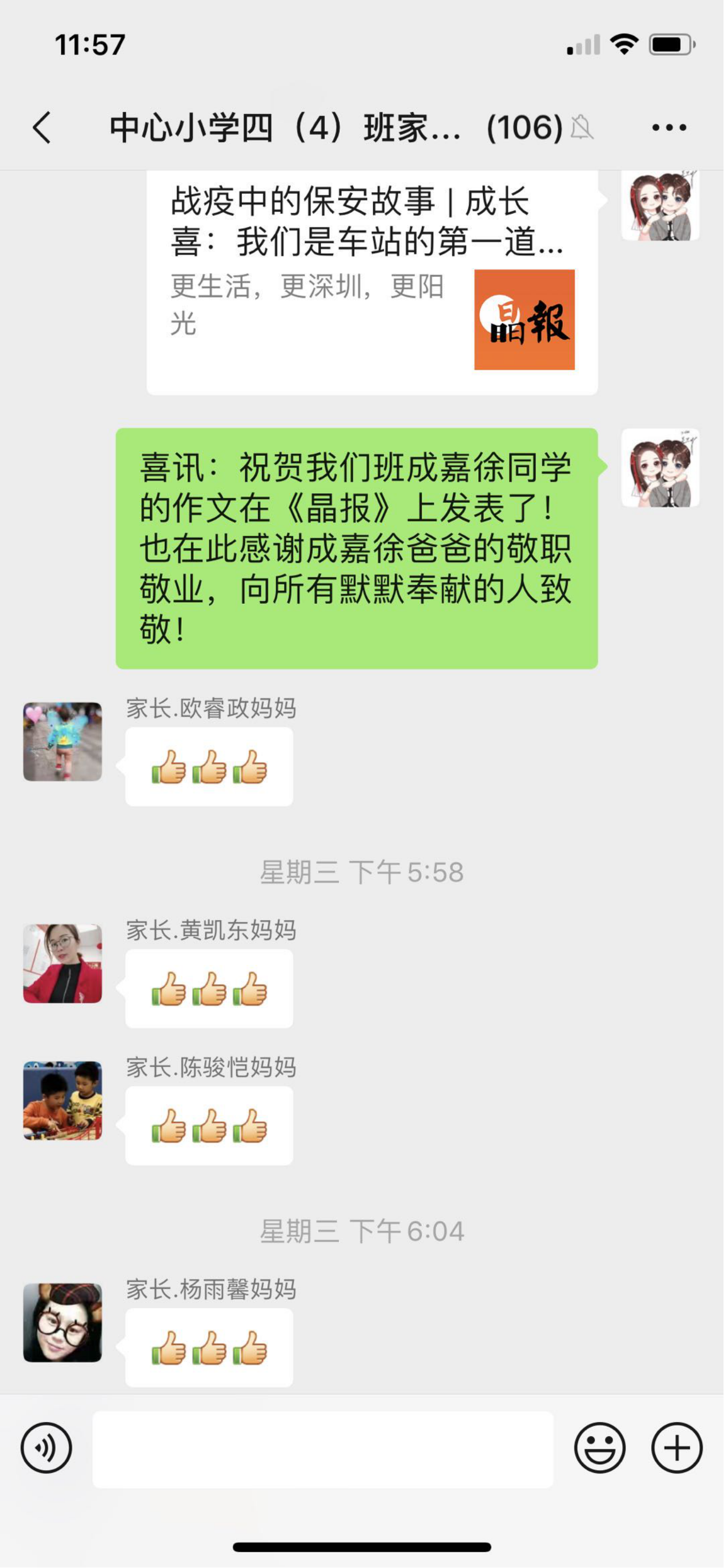 因為網(wǎng)課,班里的學生有了很多新體驗,比如嘗試自己做一頓飯,自制放大鏡,和父母一起運動鍛煉等。“有位學生寫了一篇講述他爸爸在抗疫一線忙碌工作的作文,發(fā)給我看讓我指導,后來作文在《晶報》上登了出來,我又把作文發(fā)到班級群里分享,讓大家學習這位同學,學習他爸爸這種舍小家顧大家的行為,很多家長看到了都為他們點贊?!?/p>