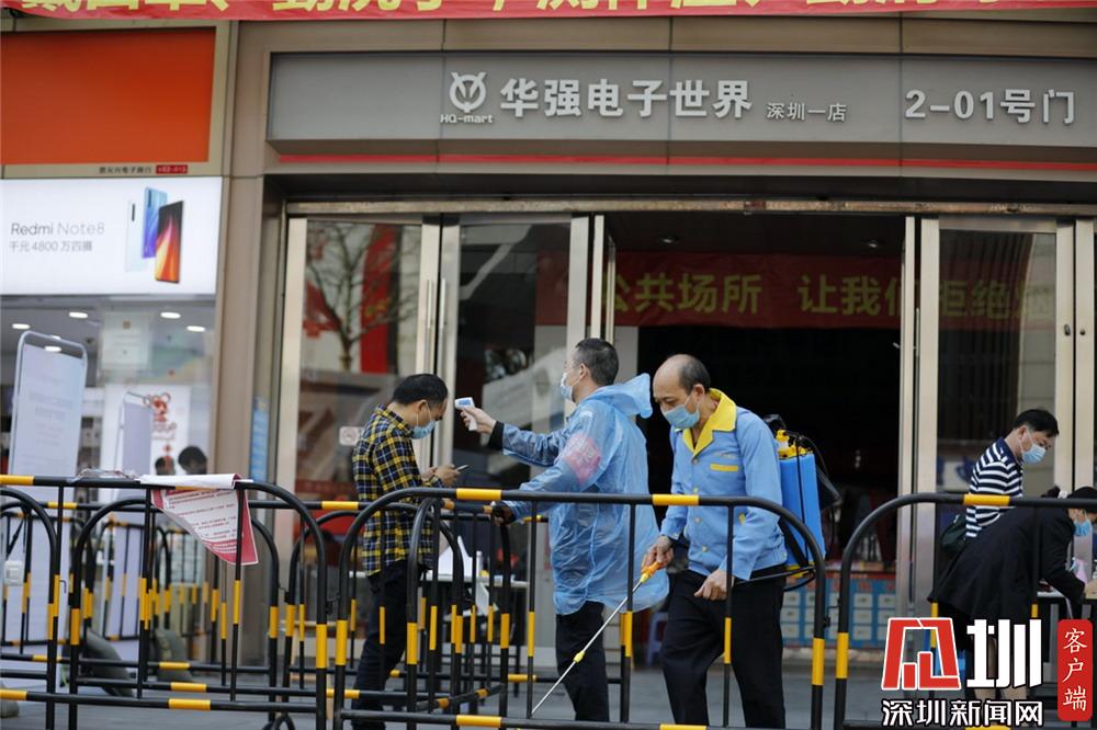 華強(qiáng)電子世界深圳一店入口,工作人員正在為入場(chǎng)者測(cè)量體溫。
