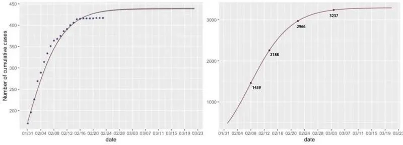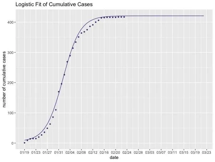 進一步地擬合深圳新冠肺炎的累計確診人數,并對累計確診人數做出預測??梢钥吹?,模型預測自2月28日起病例數不再增加,預測得到最終的累計確診人數收斂在422人左右。