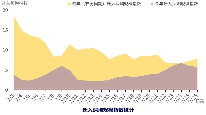 年前,深圳人口達2000萬人,春節(jié)期間最低830多萬人。從百度地圖遷徙-春運期間遷入深圳趨勢可以看到,相比去年,年后遷入深圳規(guī)模較去年一直呈現(xiàn)平穩(wěn)的低態(tài)勢,但在2月9日呈現(xiàn)出一波返程小高峰,2月14日,在深人數約1300萬人,目前約1600萬人,也就是說年后至今約有七百多萬人從外地返回深圳。