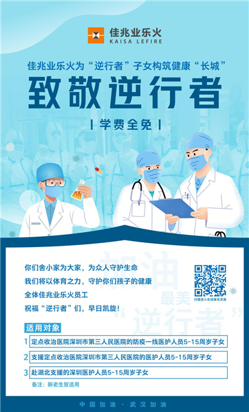 見圳客戶端·深圳新聞網(wǎng)2月29日訊(見圳客戶端、深圳新聞網(wǎng)記者 李云云 通訊員 張慧)突如其來的新冠肺炎疫情牽動(dòng)著人們的心,在這場(chǎng)沒有硝煙的戰(zhàn)斗中,廣大醫(yī)護(hù)人員舍小家為大家,日夜沖鋒守護(hù)在一線,成為這個(gè)特殊春節(jié)里最美的“逆行者”。日前,記者獲悉,佳兆業(yè)文體集團(tuán)旗下的佳兆業(yè)樂火國際文體學(xué)校將于3月1日到12月31日,為深圳定點(diǎn)收治醫(yī)院——深圳市第三人民醫(yī)院的防疫一線醫(yī)護(hù)人員以及赴鄂支援的深圳醫(yī)護(hù)人員子女提供免費(fèi)培訓(xùn)課程包,為“逆行者”子女構(gòu)筑健康“長(zhǎng)城”。