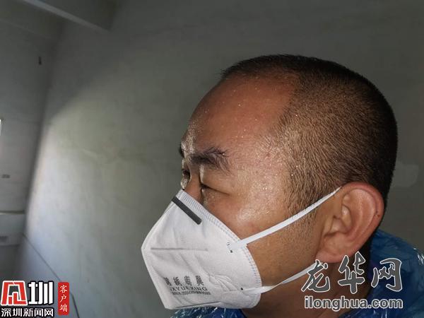 接到有返深人員的通知,他立刻帶隊(duì)趕往現(xiàn)場,多次測溫后仍體溫偏高,他不放心地叫來三位一體人員,一番確認(rèn)之后,將發(fā)熱人員送往醫(yī)院,他則獨(dú)自善后對樓道進(jìn)行消毒,將近兩個小時的折騰,他終于得以到垃圾桶旁邊喘口氣。額頭勒出的印痕和黏在后背的制服,都是每一天的勛章。