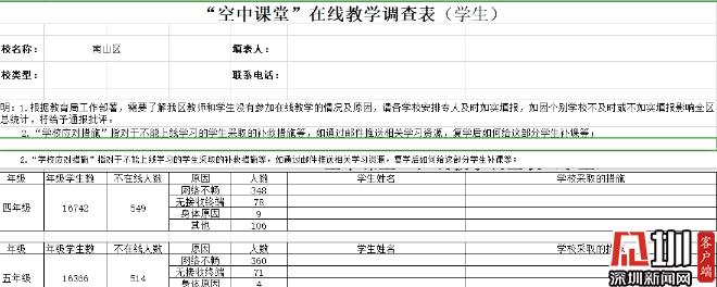 據(jù)悉,南山區(qū)教科院向全南山區(qū)學(xué)校下發(fā)了《“空中課堂”在線教學(xué)調(diào)查表》,要求學(xué)校對每一個學(xué)生的情況進行調(diào)研摸排,做好“一人一策”托底方案。學(xué)校盡量幫助解決網(wǎng)絡(luò)不暢或缺乏終端的問題;如果確實解決不了,要改用學(xué)習(xí)資源推送,或者復(fù)學(xué)后利用周末、晚上給這些孩子免費補課,趕上進度。同時,對這部分孩子及家長做好解釋工作,并進行心理方面的疏導(dǎo)。