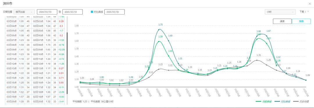 3日擁堵延時(shí)指數(shù)與2日和歷史均值對(duì)比
