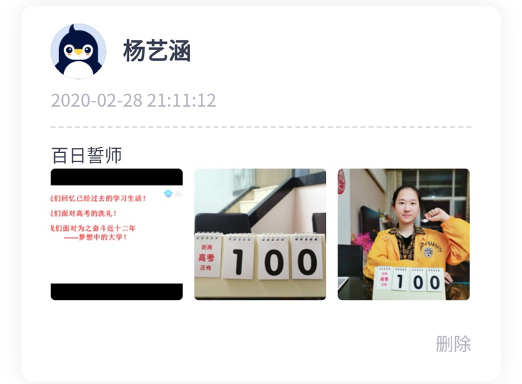 “生于非典,考于新冠,2020,我們注定不凡!疫情當(dāng)前,雖然我們隔離在家,不能像往屆那樣,齊聚學(xué)校體育館舉行誓師大會(huì),意氣風(fēng)發(fā)地走進(jìn)學(xué)校精心準(zhǔn)備的“成功門”,伴隨奮進(jìn)的樂聲高喊出我們的誓言,在“簽名紀(jì)念墻”上寫下對未來的期盼。但即使相隔網(wǎng)絡(luò)兩端,我們依然有老師祝福和引導(dǎo),有家長的鼓勵(lì)和支持,有同窗的幫助和陪伴,高考百日,我們?nèi)栽谝黄鹫癖鄹吆簦?020高考,我們準(zhǔn)備好了。”