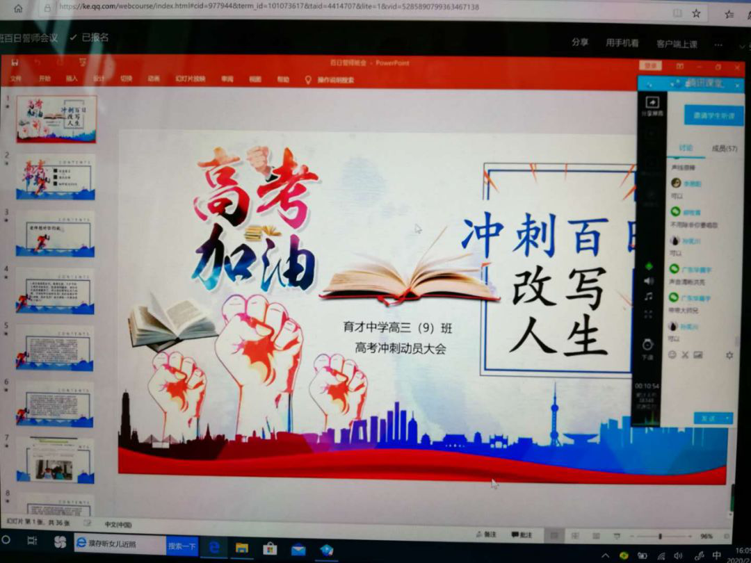 2月28日,橫崗高級中學(xué)2020屆高三全體師生利用騰訊課堂召開以班級為單位的網(wǎng)上“高考百日誓師大會(huì)”。各班精心制作PPT,提前錄制老師、家長、同學(xué)的祝福小視頻,科任老師、學(xué)生家長、學(xué)生代表連麥鼓勵(lì),同學(xué)們最后對著電子屏幕高喊百日誓詞同時(shí)下定決心,為自己的夢想,刻苦拼搏,永不言悔。網(wǎng)上“百日誓師”豪情滿懷、溫情涌動(dòng)、感人至深。