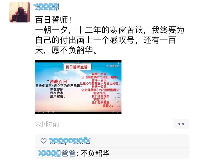 “生于非典,考于新冠,2020,我們注定不凡!疫情當(dāng)前,雖然我們隔離在家,不能像往屆那樣,齊聚學(xué)校體育館舉行誓師大會(huì),意氣風(fēng)發(fā)地走進(jìn)學(xué)校精心準(zhǔn)備的“成功門”,伴隨奮進(jìn)的樂聲高喊出我們的誓言,在“簽名紀(jì)念墻”上寫下對(duì)未來的期盼。但即使相隔網(wǎng)絡(luò)兩端,我們依然有老師祝福和引導(dǎo),有家長的鼓勵(lì)和支持,有同窗的幫助和陪伴,高考百日,我們?nèi)栽谝黄鹫癖鄹吆簦?020高考,我們準(zhǔn)備好了?!?/p>