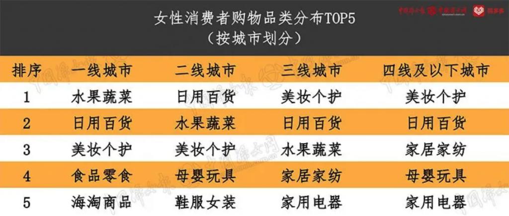 ▲在各個地區(qū),美妝個護、日用百貨類的商品都是女性消費者的最愛