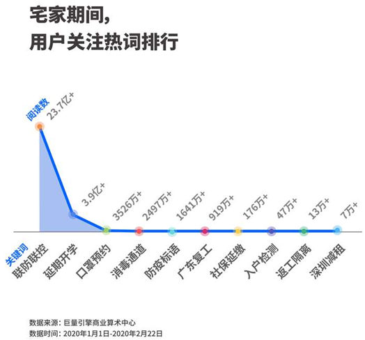 在1月1日至2月22日的頭條用戶閱讀數(shù)據(jù)中,聯(lián)防聯(lián)控、延期開學、口罩預約成為頭條平臺上最熱的關(guān)鍵詞前三位。此外、社保延繳、返工隔離等政府措施都被疫情下的手機用戶頻繁閱讀。