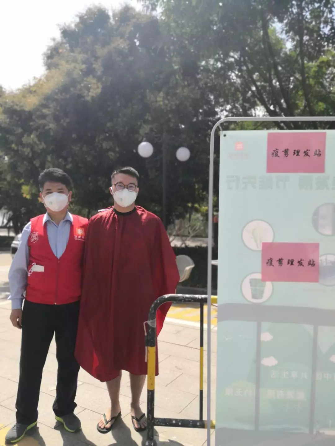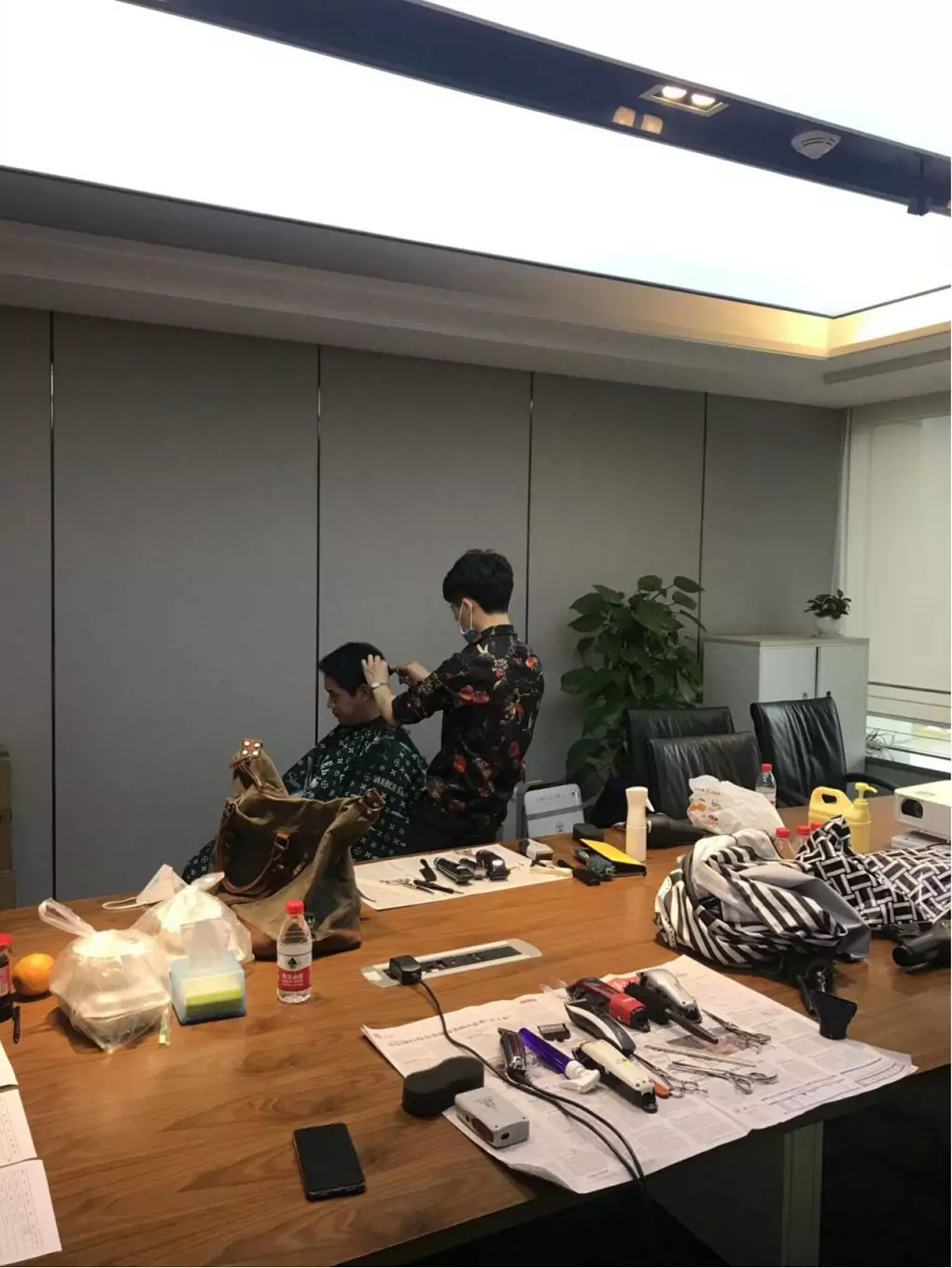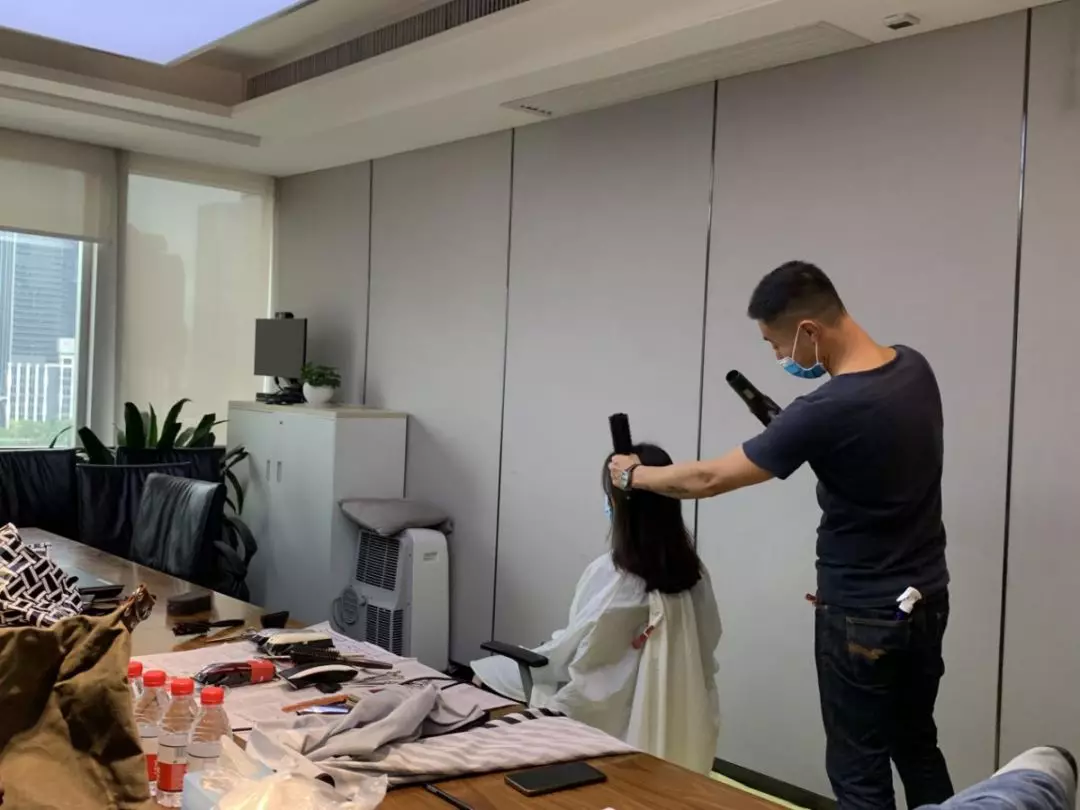 公司本部,1303會議室,臨時理發(fā)室“生意”也火爆極了。公司工會邀請了兩名專業(yè)的Tony老師,為近90名員工提供免費的理發(fā)服務(wù)。為減少人員聚集,理發(fā)采取提前線上預(yù)約,分時段進行,確保安全的同時,盡可能讓有需要的同事都能理上發(fā)。鋪上一次性地毯,坐上椅子,圍上一次性“斗篷”,Tony老師一頓熟練的剪發(fā)操作后,再用吹風(fēng)機整好造型,就完成了理發(fā)的全過程。臨時理發(fā)師的搭建,有效解決了員工生活上的困難,幫助他們以良好的精神面貌投入工作來。