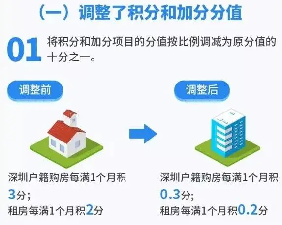 (1)深圳戶籍購房從每滿1個月積3分,調(diào)整為積0.3分;租房從每滿1個月積2分,調(diào)整為0.2分。