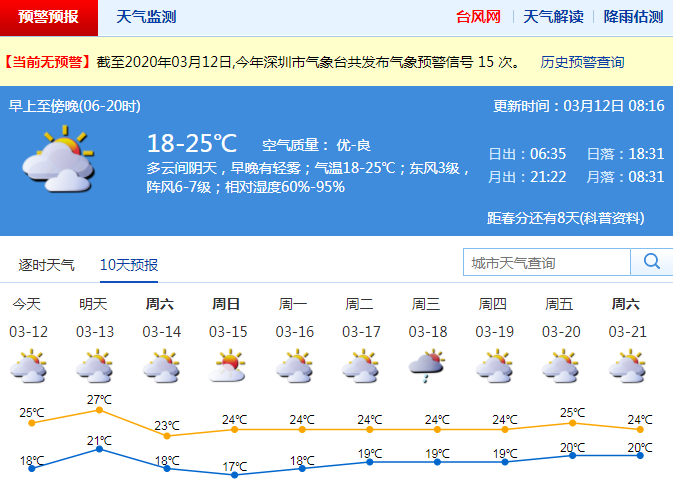見(jiàn)圳客戶端·深圳新聞網(wǎng)2020年3月12日訊 深圳12-13日多云,氣溫明顯回升,溫暖濕潤(rùn),早晚有輕霧或霧和分散小雨,12日氣溫18-25℃;13日夜間受冷空氣影響,有陣雨,沿海、高地和海區(qū)有6-7級(jí)陣風(fēng);14-15日多云,氣溫略降,早晚稍涼;16-17日多云天氣溫暖。