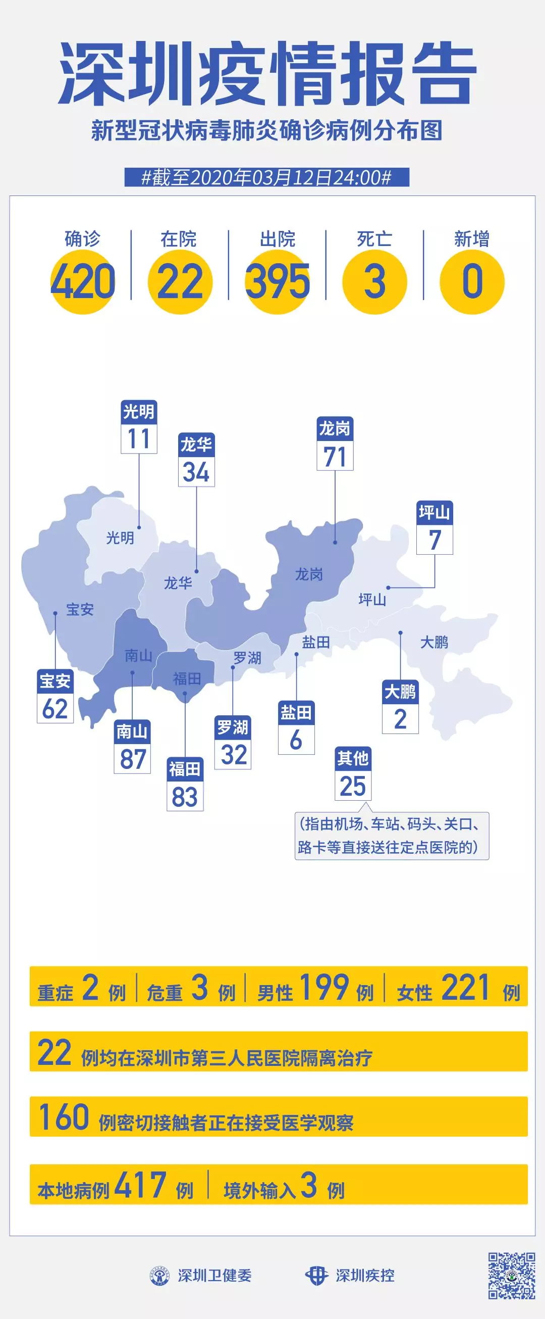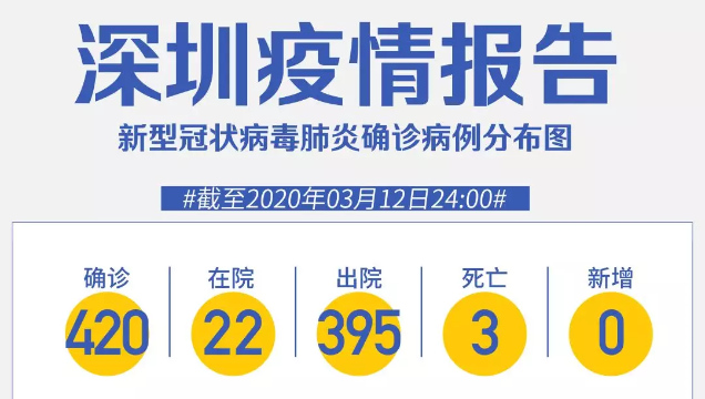截至3月12日24時,深圳累計報告“新冠肺炎”確診病例420例。3月12日當天全市無新增確診病例,當天出院病例3例。