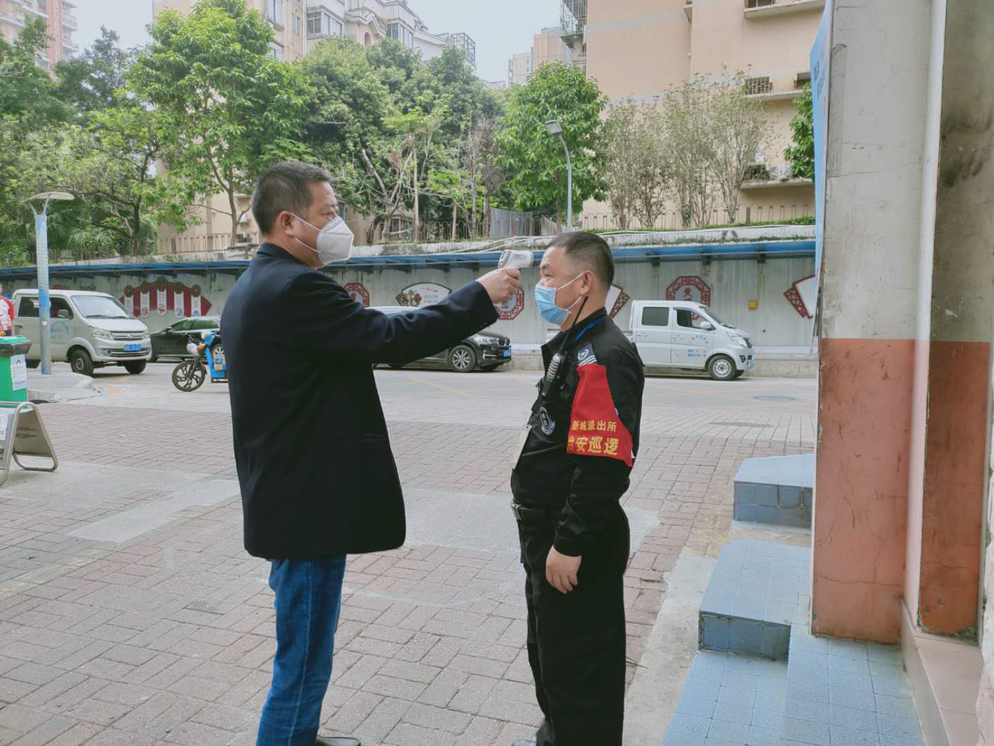 “梁經(jīng)理,我也是一名黨員,我申請(qǐng)加入咱們小區(qū)的疫情防控隊(duì)伍?!痹诓趟龠_(dá)的帶動(dòng)下,兒子蔡榮釗也積極投身防控“疫”線中。每日下班后,他都從寶安的工作單位趕回小區(qū),來到門崗卡點(diǎn),為進(jìn)出小區(qū)人員進(jìn)行登記、測(cè)量體溫,攔截外來人員和車輛。蔡榮釗這一堅(jiān)持,就是一個(gè)多月,得到了物業(yè)管理處和業(yè)主(住戶)們的高度好評(píng)。