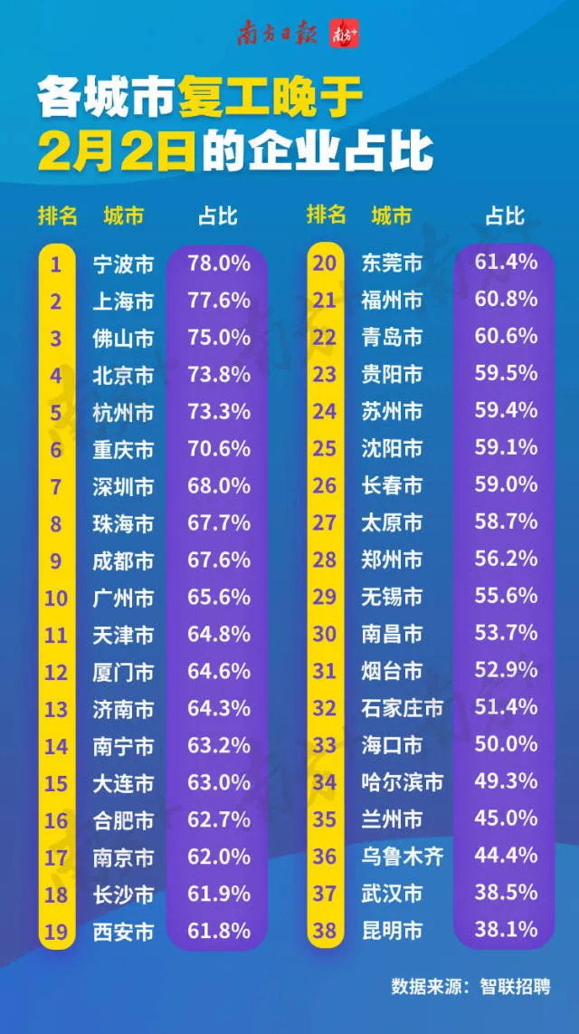 同樣根據(jù)這份《報告》,全國各城市晚于2月2日復(fù)工的企業(yè)占比統(tǒng)計排名顯示,前10名中9個城市均為南方城市,寧波企業(yè)延遲復(fù)工響應(yīng)度最高,確定2月2日后復(fù)工的企業(yè)占比達到了78%。前10名中4個為廣東城市,分別是佛山、深圳、珠海、廣州。