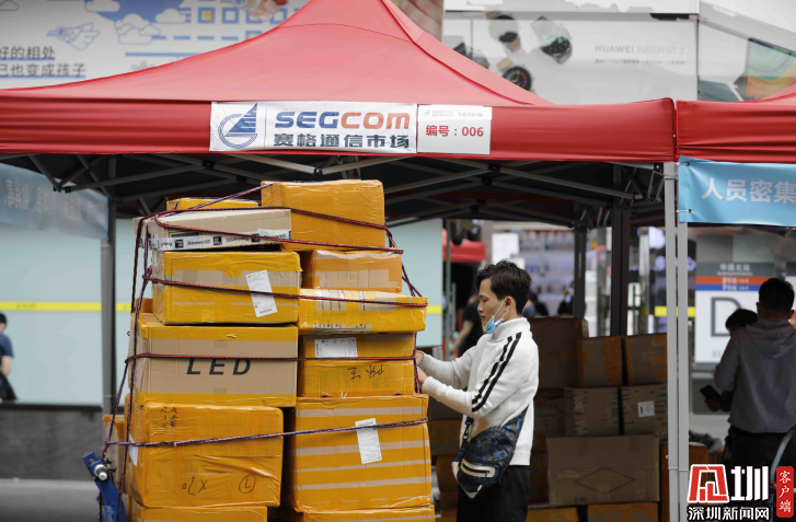 華強(qiáng)北步行街的臨時(shí)帳篷旁邊,一位從業(yè)者正在整理貨物。