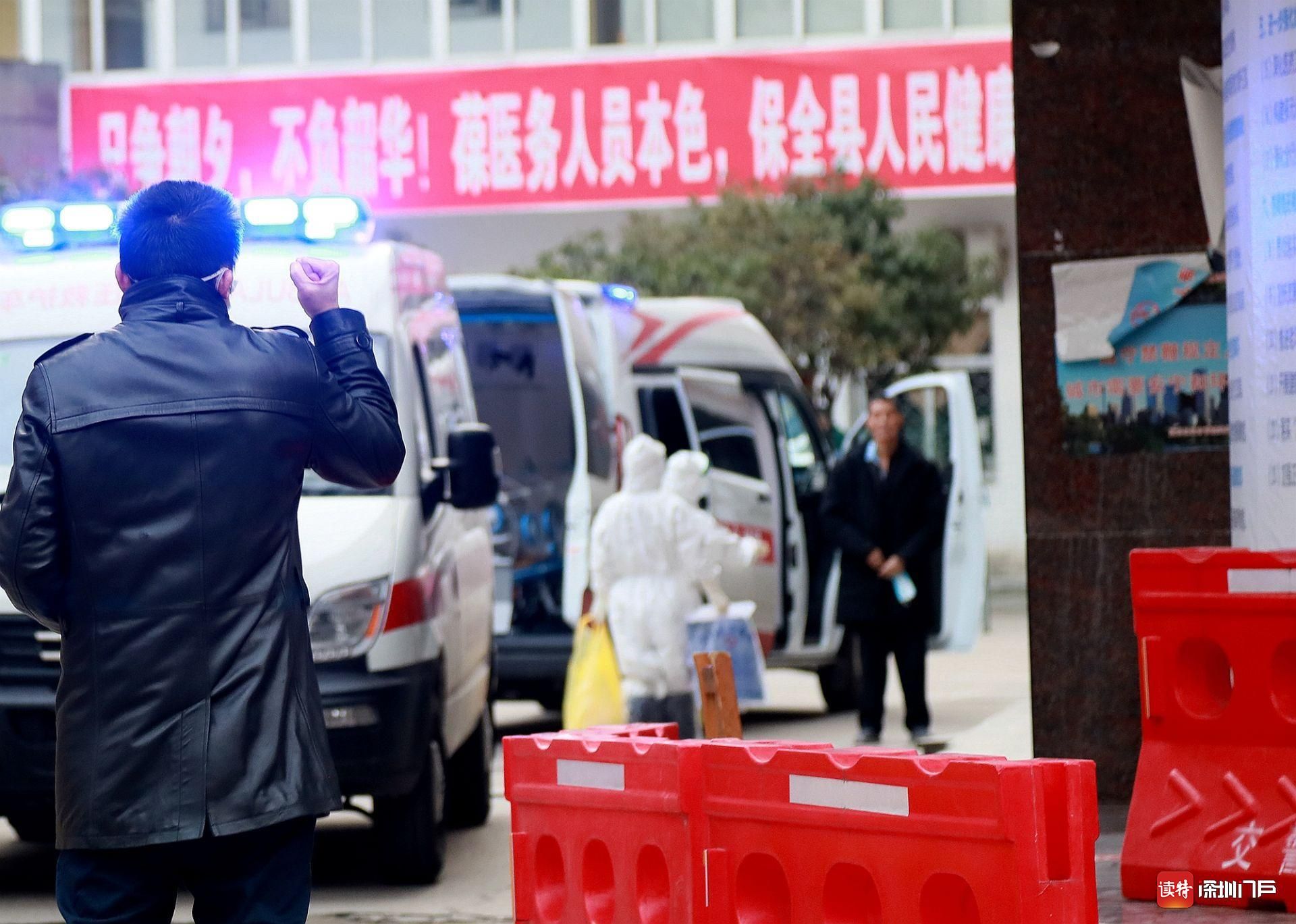 2月29日,監(jiān)利縣中醫(yī)院,一位重癥患者即將轉(zhuǎn)往荊州救治?;颊叩膬鹤勇動嵹s來,遠(yuǎn)遠(yuǎn)地向父親舉起拳頭,高喊“加油”。